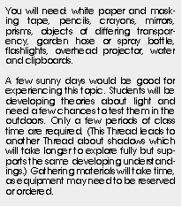 This Thread offers fourth through sixth grades the opportunity to tackle the theory of light through different and more serious experiences outdoors. They are ready to ask and be asked some deep questions which will hopefully open their analytical minds to the possibilities of even deeper questions for real understanding. Providing them with tools and time is all we need for them to create a fairly good theory of the nature of light. Even if they don't come up with the same theory that scientists currently hold, they are learning about theory generation, how we come up with the best explanations that we can until we learn something new to help us generate a better explanation.