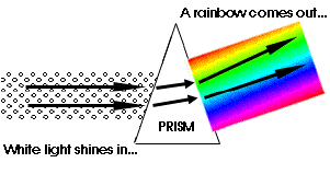 A prism is a piece of glass shaped like a triangular solid, or a triangle stretched upwards to make a three-dimensional shape. The light travels into the triangle from a face of the triangle at a certain angle. Whenever light goes from one medium (air) to another (glass) the different colors of light bend slightly differently. The pencil in the glass of water trick is an example of this. Usually, through a flat medium like a pane of glass, the light enters, colors bend by a specific amount, and then bend back into one another going out the other flat side. But the prism, because it is not flat but triangular, doesn't allow the colors to bend back into one another. Instead, it encourages more bending by the angle it has on its other side. So, the white light enters the glass and the colors bend and take different paths through the prism. When they reach the other side, instead of meeting up again with each other passing back into air, each color splits even more from the pack by the same angle again and takes a slightly different path out of the prism. We see the colors break open in the beam. A spray of water will also make this happen as the little droplet shapes of water work like miniature prisms. You get a misty rainbow in the droplets as the white light package gets ripped open in the spray -- exactly as it happens in the sky with real rainbows.