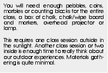 This Thread will examine the orientation of the Sun, ourselves, and shadows from the reverse way around. It will seem like a tricky game, but once the idea of the linear nature of light travel is experienced, we can talk more about light in the next Thread. To do so, again we will exploit this age group's fascination with mystery, team learning, and the ability to string two or more variables together into a model. Second grade teachers should consider choosing this version of the Thread over the version intended for younger (K-2) students.