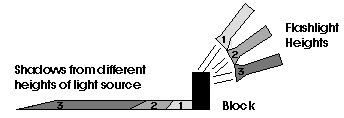 tilted light source (in other words, the angle between the light source and the ground) and the size of the object it is illuminating determine the length of the shadow that the object casts. The object blocks the light coming from the source so that nothing behind the object gets any direct light. The length of the shadow is a result of how high above or below the top of the object the light source is. Imagine if the light source were directly above the top of the object. Would there be a shadow? No, not one that would be visible around the object. Twist the light source a little down from the top, and a shadow appears behind the object, but is very short. This is because as the light source moves down, the shadow is being created by the small area of the object blocking the light. Imagine straight lines coming down from the light and hitting the object. The higher the light, the less light lines get blocked by the object and hence the less shadow. Thus, the lower the light source is aimed at the object, the more the object blocks the lines, or rays, of light.The key to understanding shadows is to realize that the light source and object must be lined up in order to make a shadow appear. In fact, if the object is placed anywhere along that line, it will produce a shadow of the same length behind the object. It is only when you change the orientation of the light source that the shadow changes. That makes sense in one order: light hits an object and casts a shadow. But experiencing the connection of these fundamentals in a different arrangement is good for rooting our experiences more firmly. In other words, trying to predict where to place an object to cast a shadow at a specific location: essentially trying to locate the path of the light.