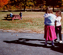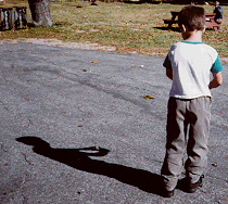 Play Shadow Tag again, this time with some questions afterward. Was it hard to play this game? We had to be careful to watch our shadows and the person who was "It" very carefully. When was it hardest to be careful: when running towards the Sun or away from it? Why? How are shadows made, then?