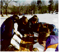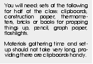 The graph paper boards are getting warm by now. Ask the students to try and tell which one is warmer. They will have difficulty. How then could we get a more sensitive temperature reading from the boards? Thermometers, of course! But how could you put a thermometer inside the graph paper to measure its temperature? They will ponder this a while. How do you take your own temperatures? In your mouths? Could you make a little mouth on the graph paper somehow? The best advice is a tiny slit cut into the paper so a thermometer can slide in between the paper and the board. What supplies do we need to do this? Bring everyone back inside to gather these.