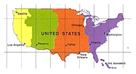 Using a globe, have the students locate the United States. There are four time zones in North America: Eastern, Central, Mountain and Pacific. Can they discern how many degrees there must be across the country's mainland from the number of time zones across it? Think if there are 24 hours in a day, there should be 24 time zones. 24 goes into 360 degrees 15 times. So, each time zone should be approximately 15 degrees across, making the United States 15 degrees times 4 across the globe, or 60 degrees. Check this with the latitude measures on the globe. You will have to account for fractions. What do we notice about how regular or irregular the real time zones are? Why might this be so? Think about politics and the shapes of states.