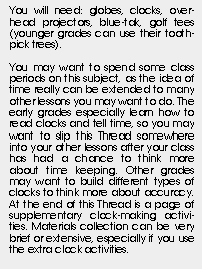 We will think more about time and the Sun and the shape of the Earth. It is important to realize that the Sun does not rise at the same moment in different places and that clocks around the world are set to their "local" time. The National Science Education Standards require that the motion of the Earth be linked to the changes on it, such as length of day. The vocabulary words which can be integrated in this Thread are time, clock, time zones, orbit, and international date line.