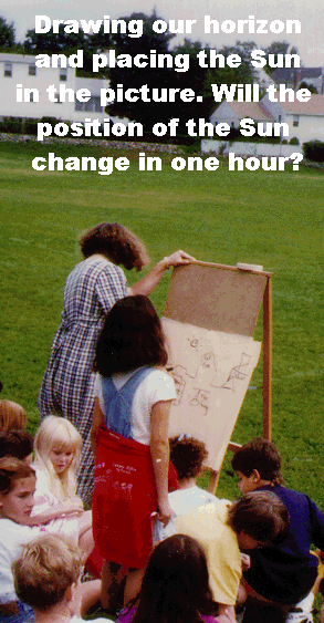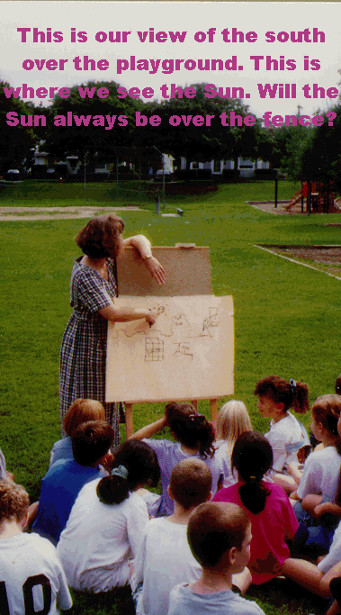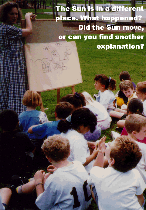The second part of every investigation involves talking about what has just happened to develop some theories about it. Here, Mrs. Thom is pointing out what they have all agreed is a fact they have just observed: where the Sun is. The students are now contemplating this and making some predictions about what might happen next. |